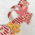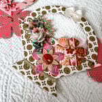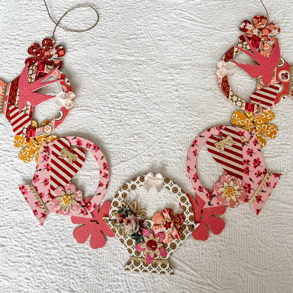 A chain of brightly colored baskets in pinks, white and gold. The baskets carry striped hearts and pink polka dot birds with an assortment of flowers. The swag is made of beautiful Japanese papers mounted to card stock. Each basket is 4.5 inches wide and the garland of five baskets overlapping the brighly colored flowers is roughly 27 inches long.