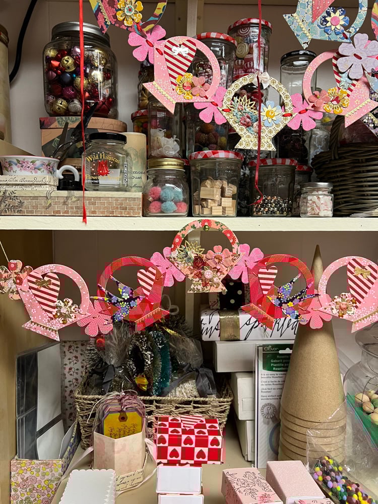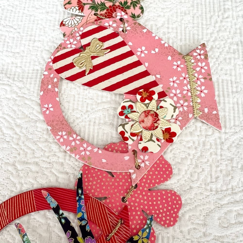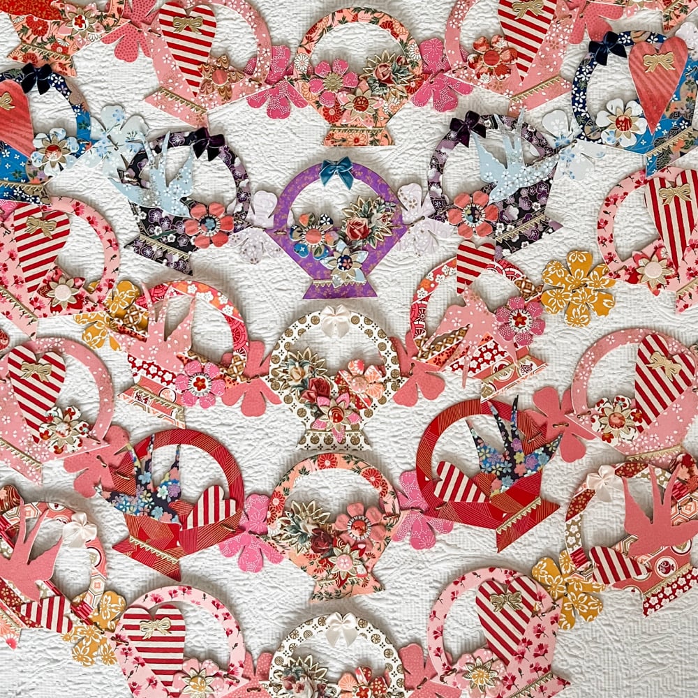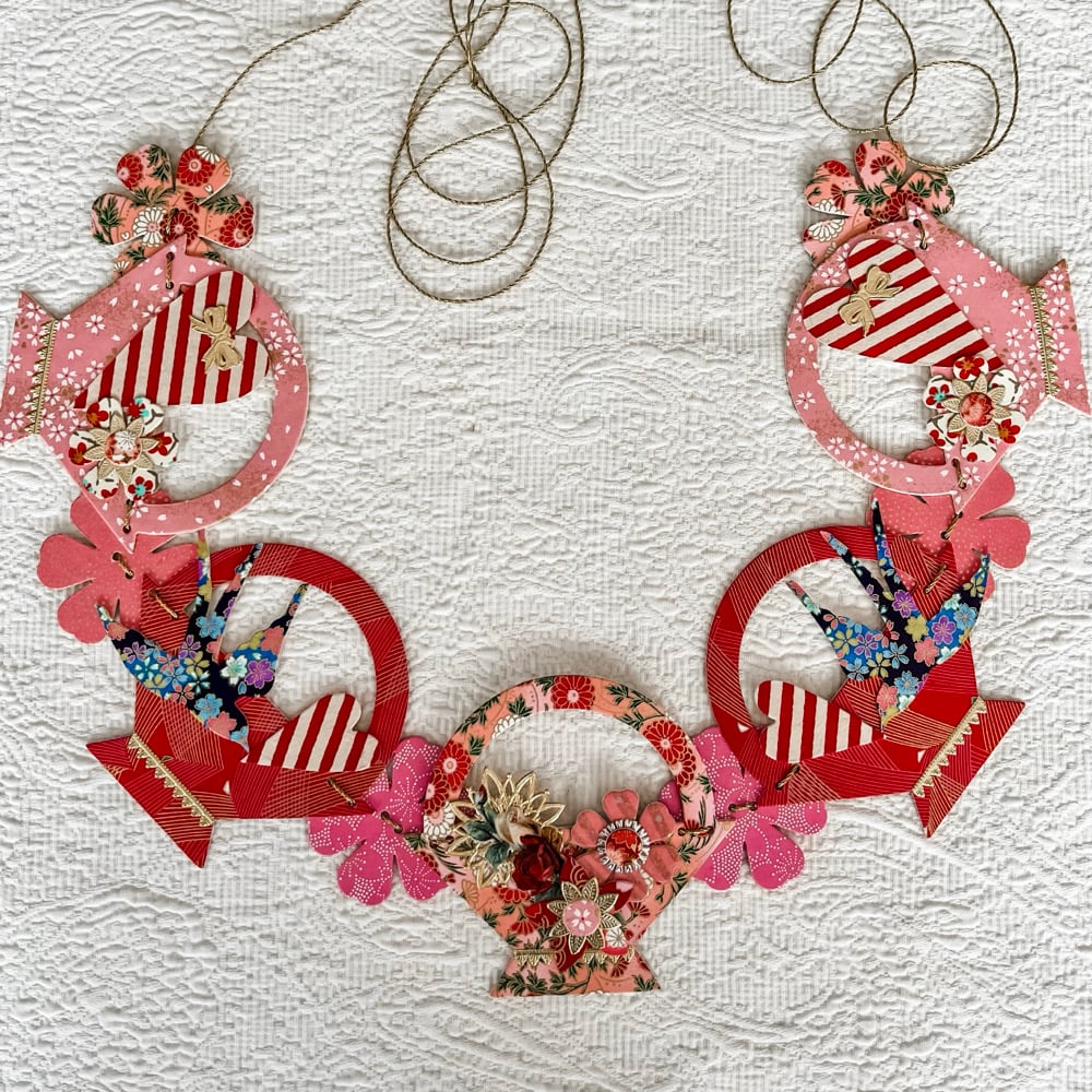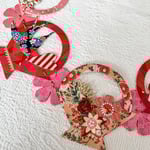 Baskets of pink and red, my favorite color combination, carrying striped hearts and navy swallows with pink blossoms. Each basket measures 4.5 inches wide and the chain of five baskets measures 27 inches long. I have loved draping these from shelves.