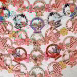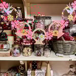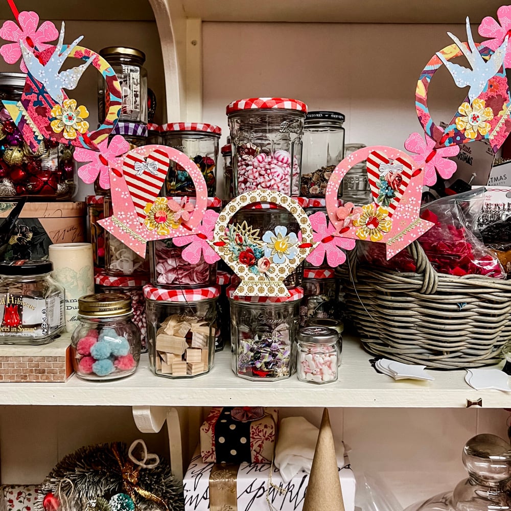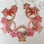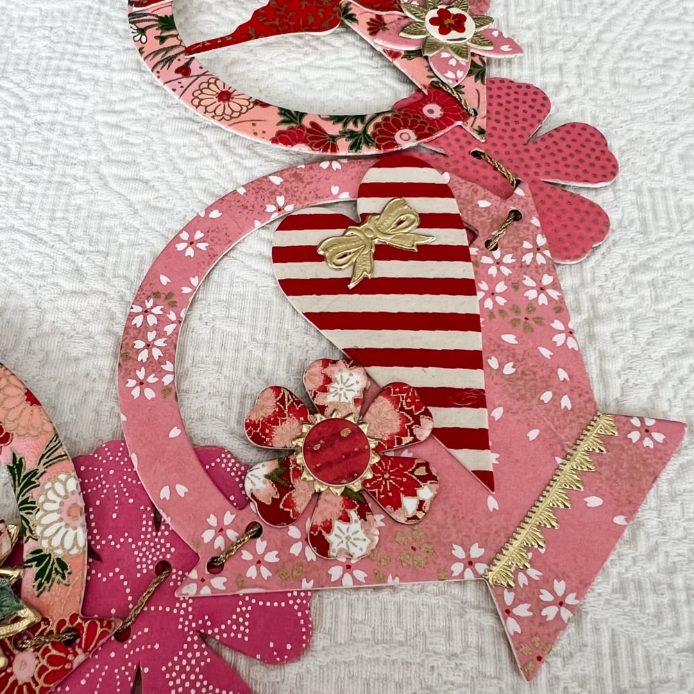 Pink baskets brimming with striped hearts and red swallows. Beautiful Japanaese papers mounted to cardstock and accented with the gold foil Dresden trims. A cheerful sight drapped from a shelf, cupboard, headboard or a mantel. The five basket chain with the single blossoms measures approximately 27 inches long.