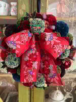 A 10inch wreath of Christmas colors dotted with shiney holly leaves, pine cones and punctuated with a gorgeous red bow of vintage ribbon from Eastern Europe.