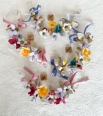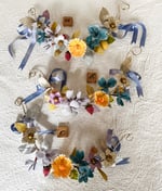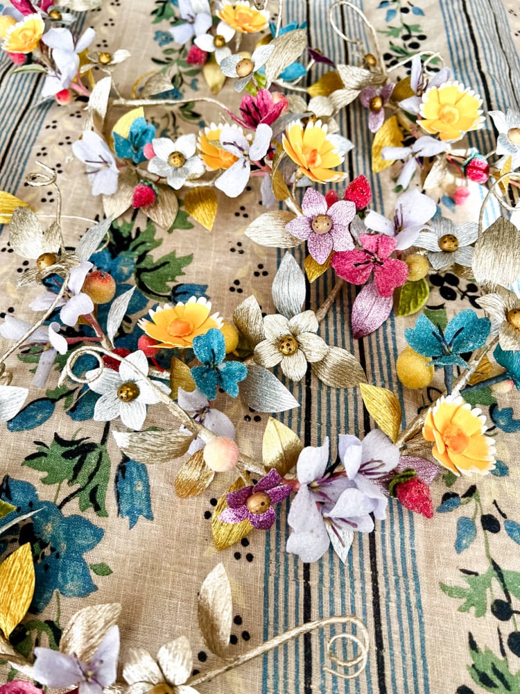 A collection of metallic leaves, sugared blossoms, glittery fruits and a paper yellow “tidy tip” form a garland on a 12 inch wire. The ends are finished with vintage satin ribbons.
