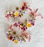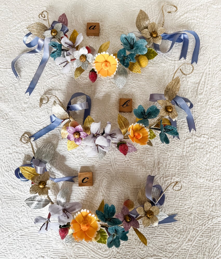 I have enjoyed learning how you use these swags: Draped on a candleabra, frame or basket, one of my favorites, creating a crown for statuary. There are two colorways, rose or cornflower blue but I have learned you have a very discerning eye and prefer to choose your specific swag so they are lettered.