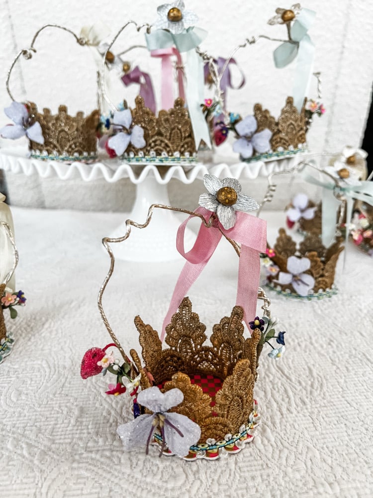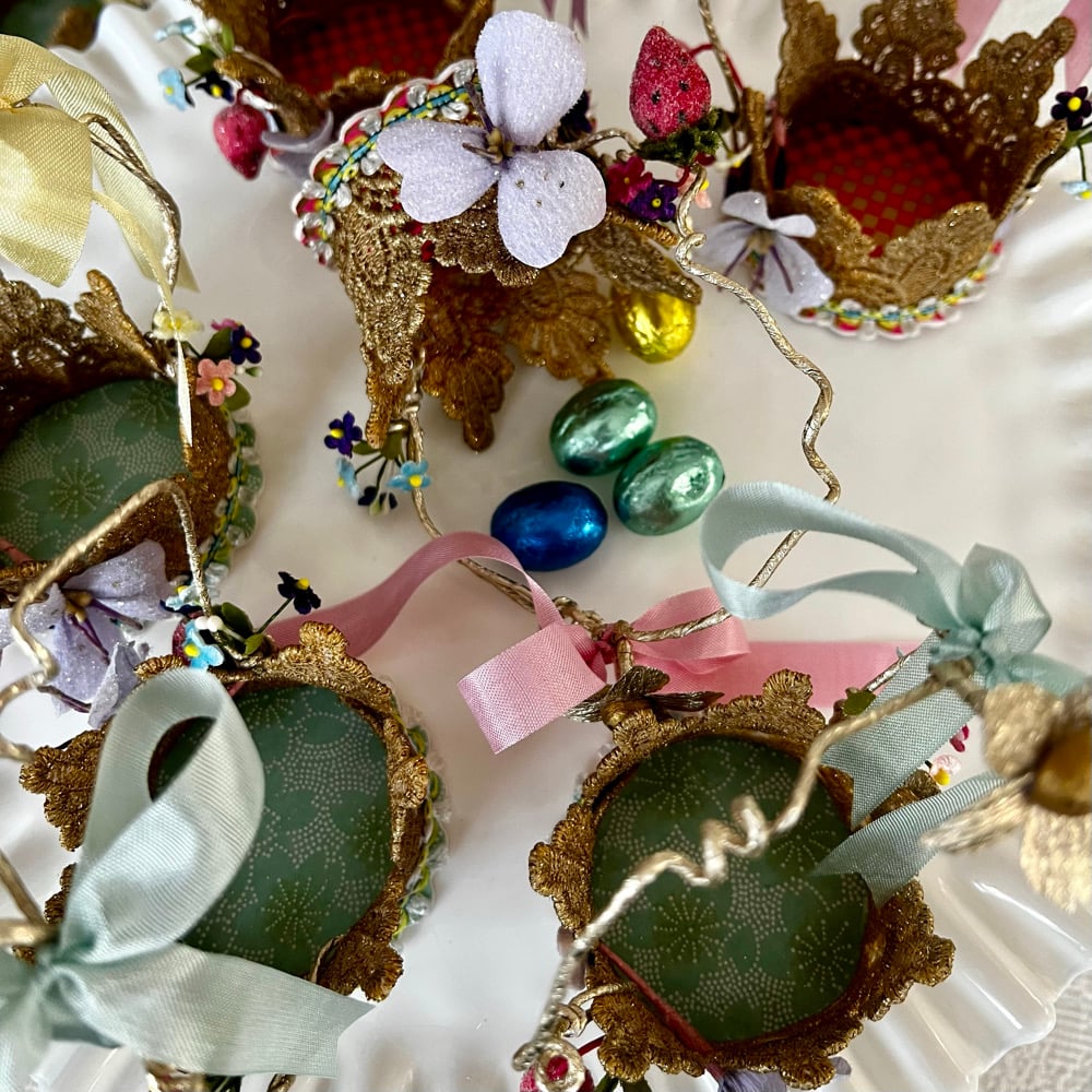 A stiffeneed lace three inch basket with handmade sugared blossoms and fruits, tiny Czech flora and a wavy wire handle. These little baskets are fairy-like and can be filled and gifted or suspended from a branch. There are 4 different colored bows so please select above.
