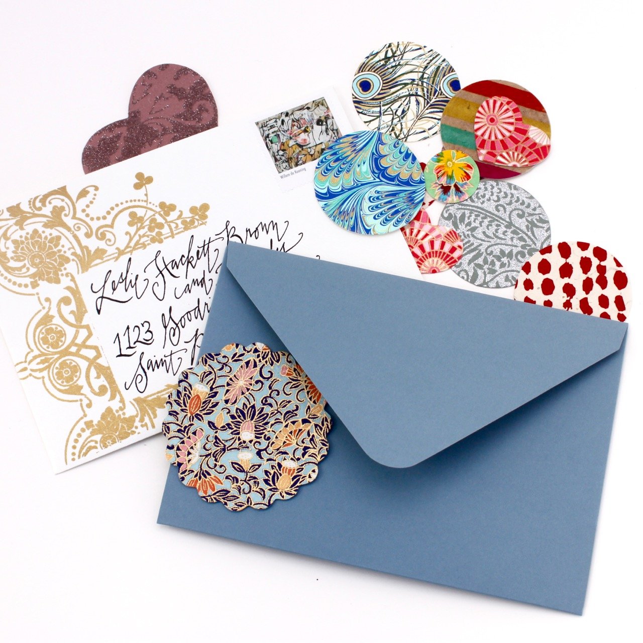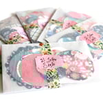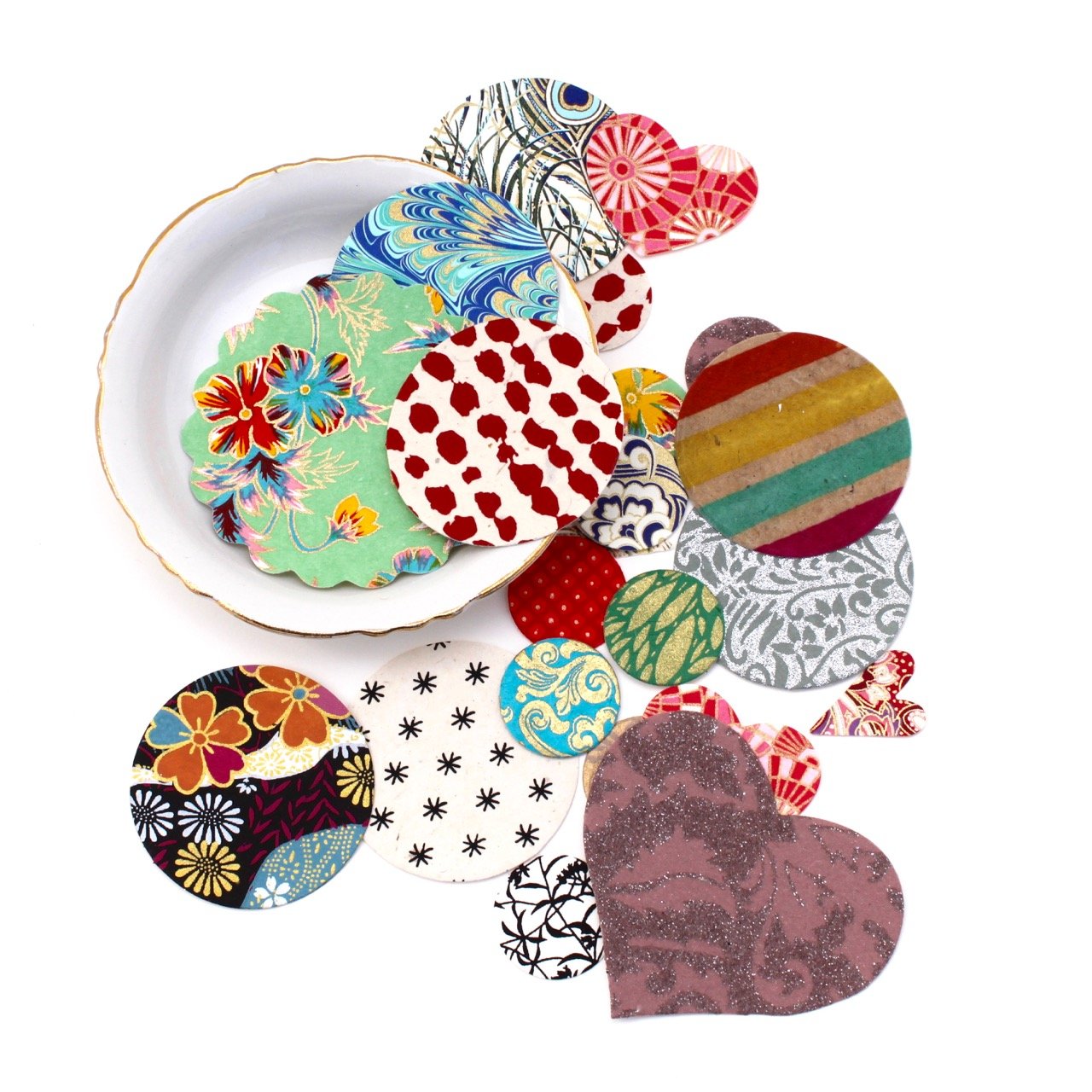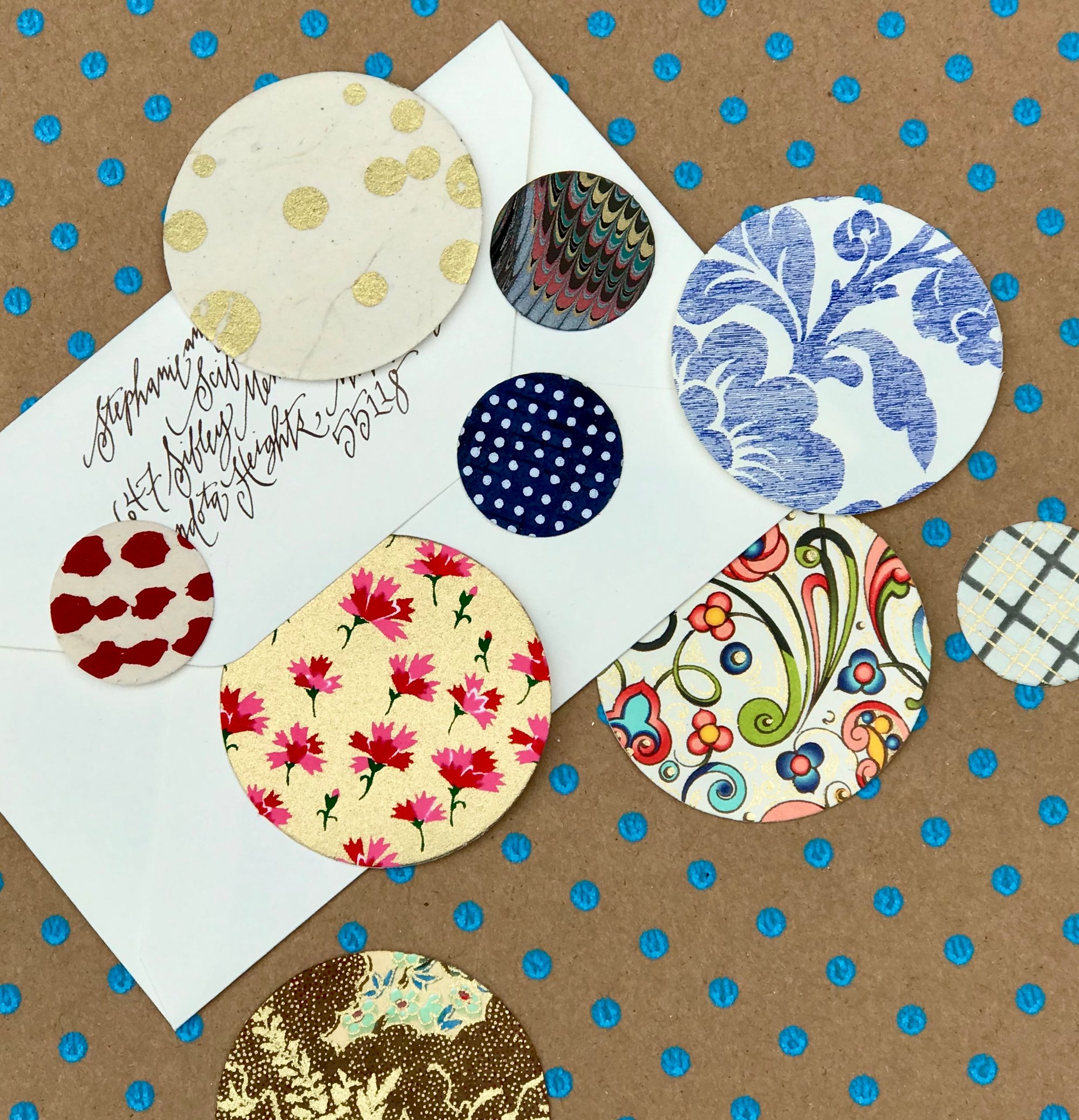Every project leaves beautiful remnants! The drawers in my studio are filled with scraps of paper and ribbon ends. When the paper pieces are too small to cover a cone or line an envelope they become tags or seals! When friends visit they rummage through my little soap box to put together a collection. Distant friends often request the seals I used on their letters and parcels. So, I have put together a few packages of seals in various shapes, sizes, and colors. Each packet contains approximately 21 seals. Enjoy!