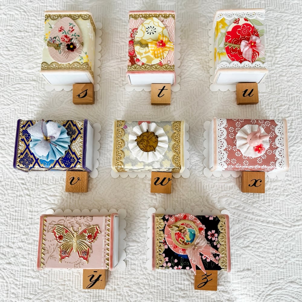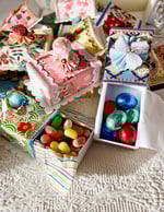 The ever popular slide box all festooned, jeweled, sequined and glittered up! Add a little tissue, some jellybeans or a tiny treasure. Perfect for an Easter basket or table scape. There’s a design for everyone, please make your selection above.