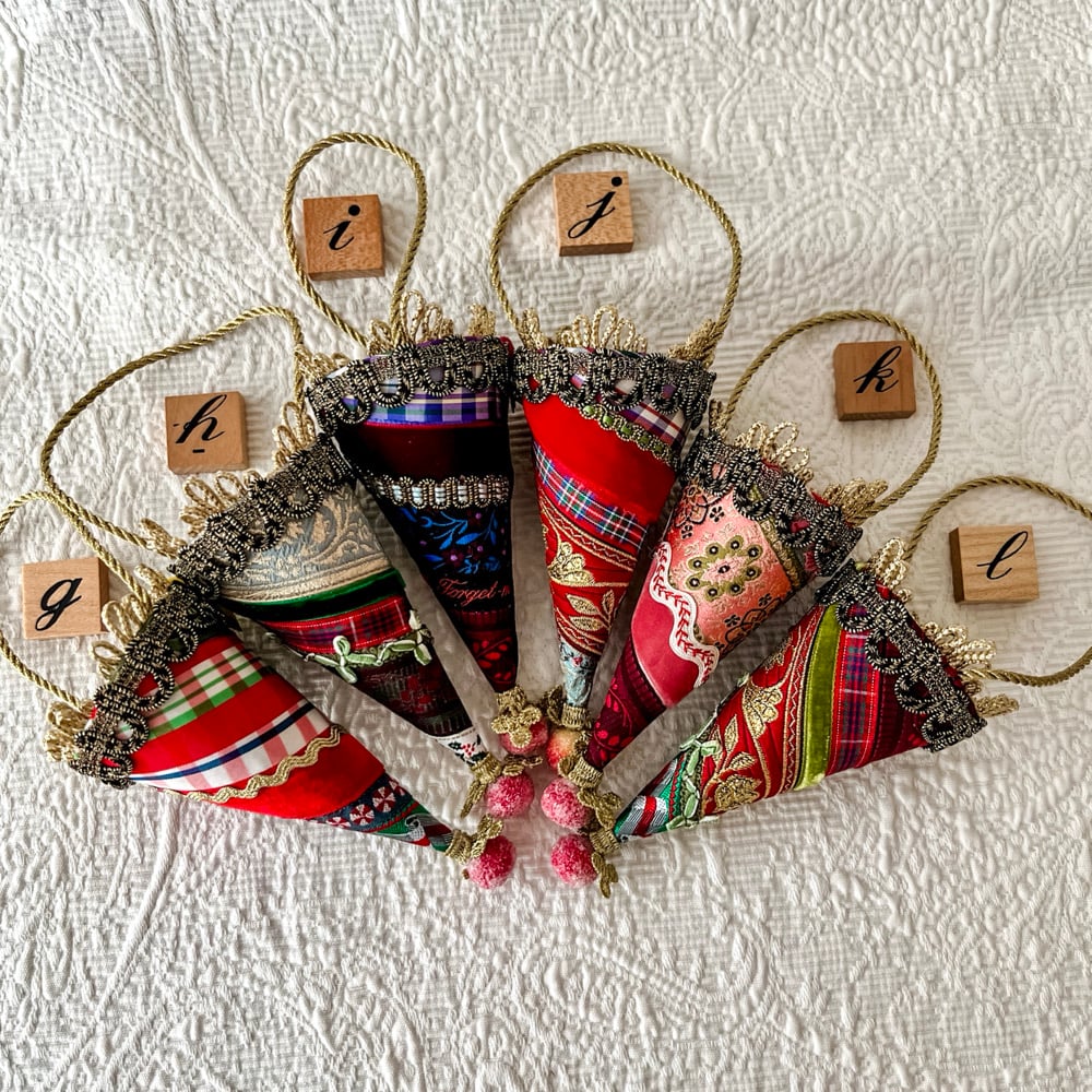 A four inch cone covered in a swirl of jacquard, plaid and velvet ribbons. Finished with a French scalloped trim and a tiny sugared fruit. Place at the table or enjoy on your tree. The colors and textures are dazzling!