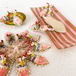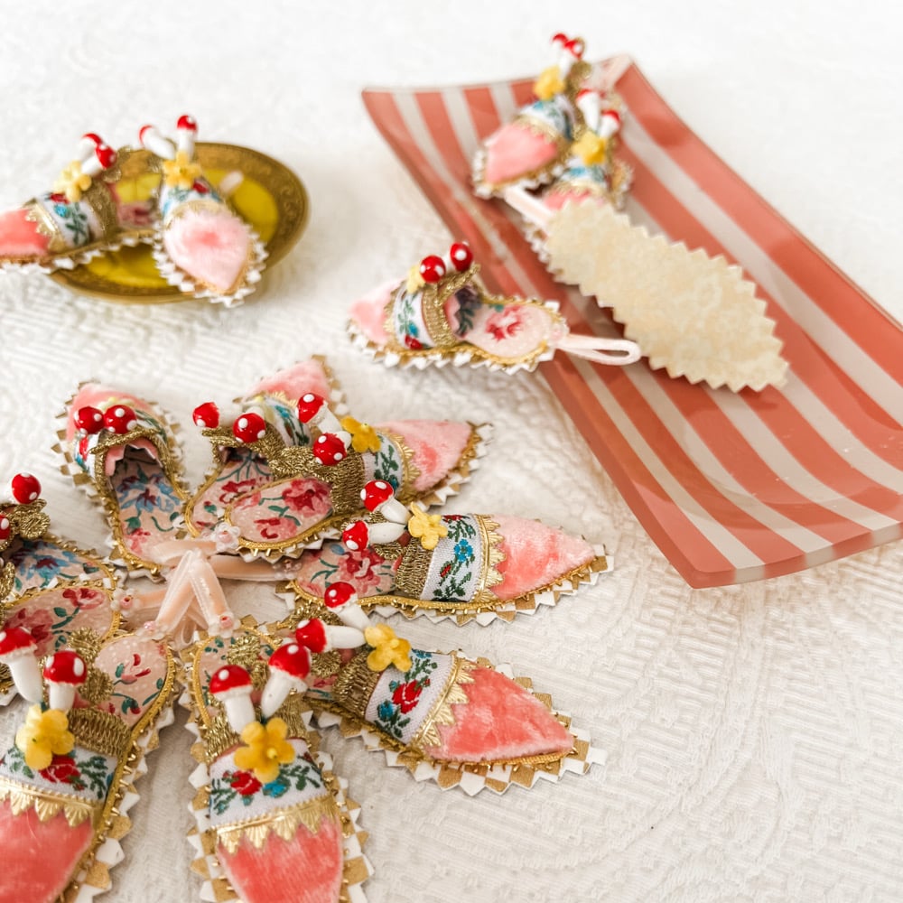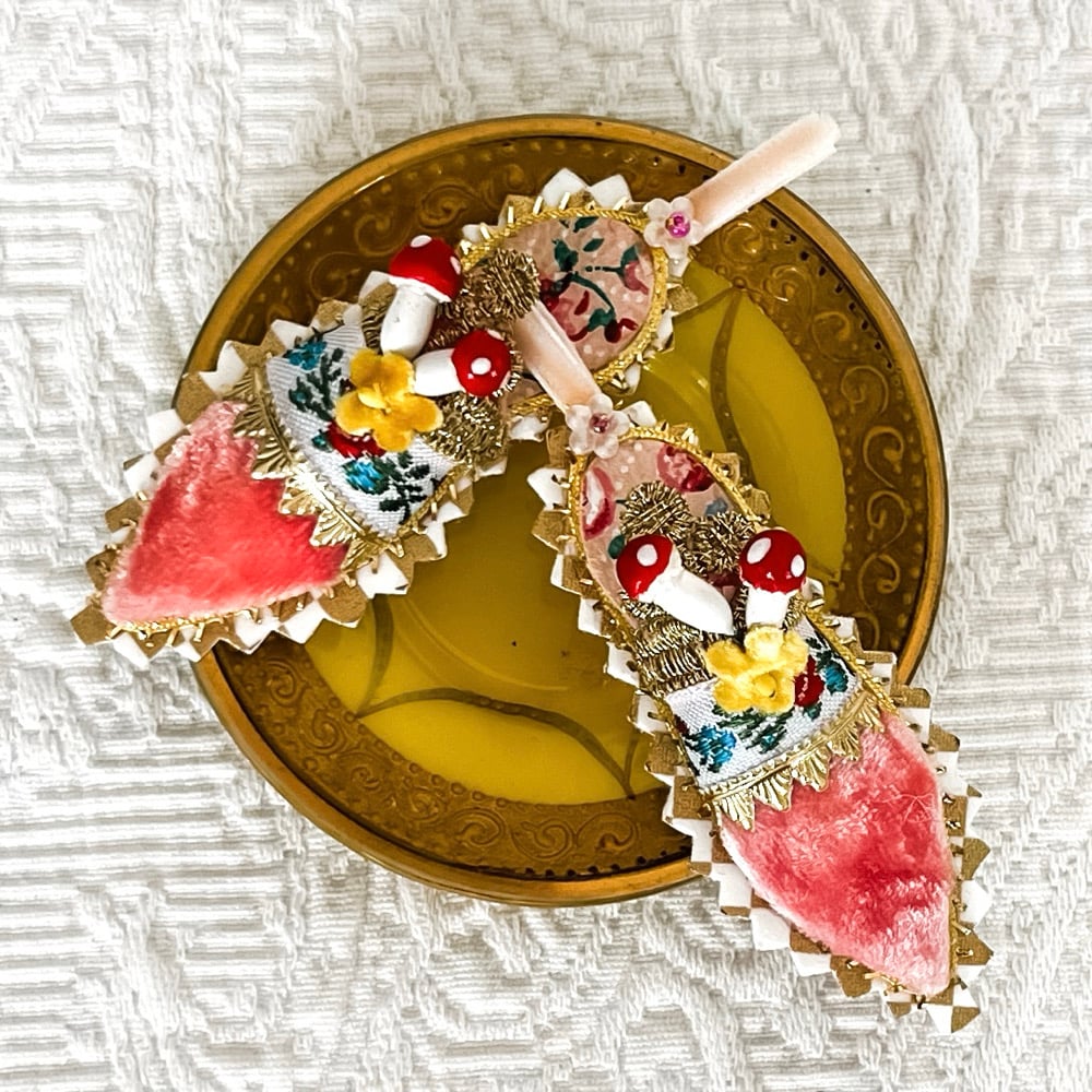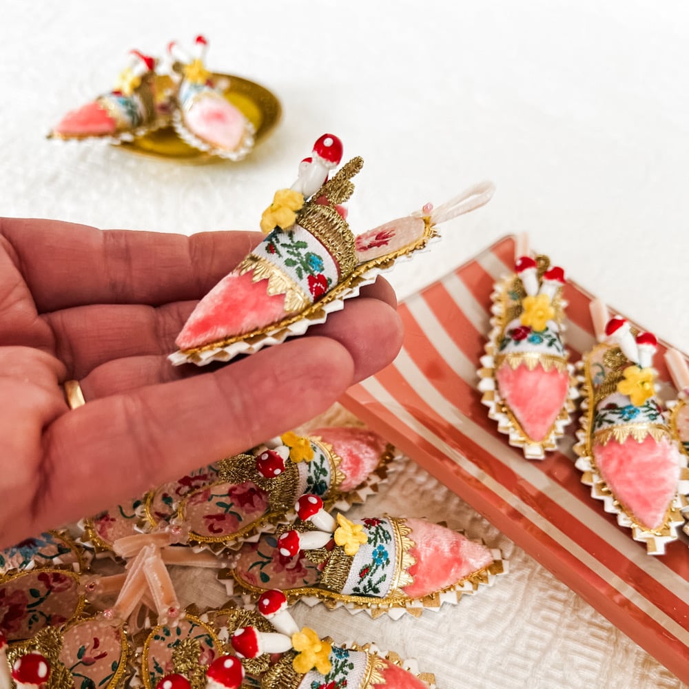 The three inch slipper is made with dyed silk velvet and a sole of vintage wallpaper and that's just the beginning, I added a jacquard ribbon, little gold trim and a mushroom and flower cluster. They are darling tucked into a centerpiece, under a cloche or hung on your Easter tree. Sold individually.