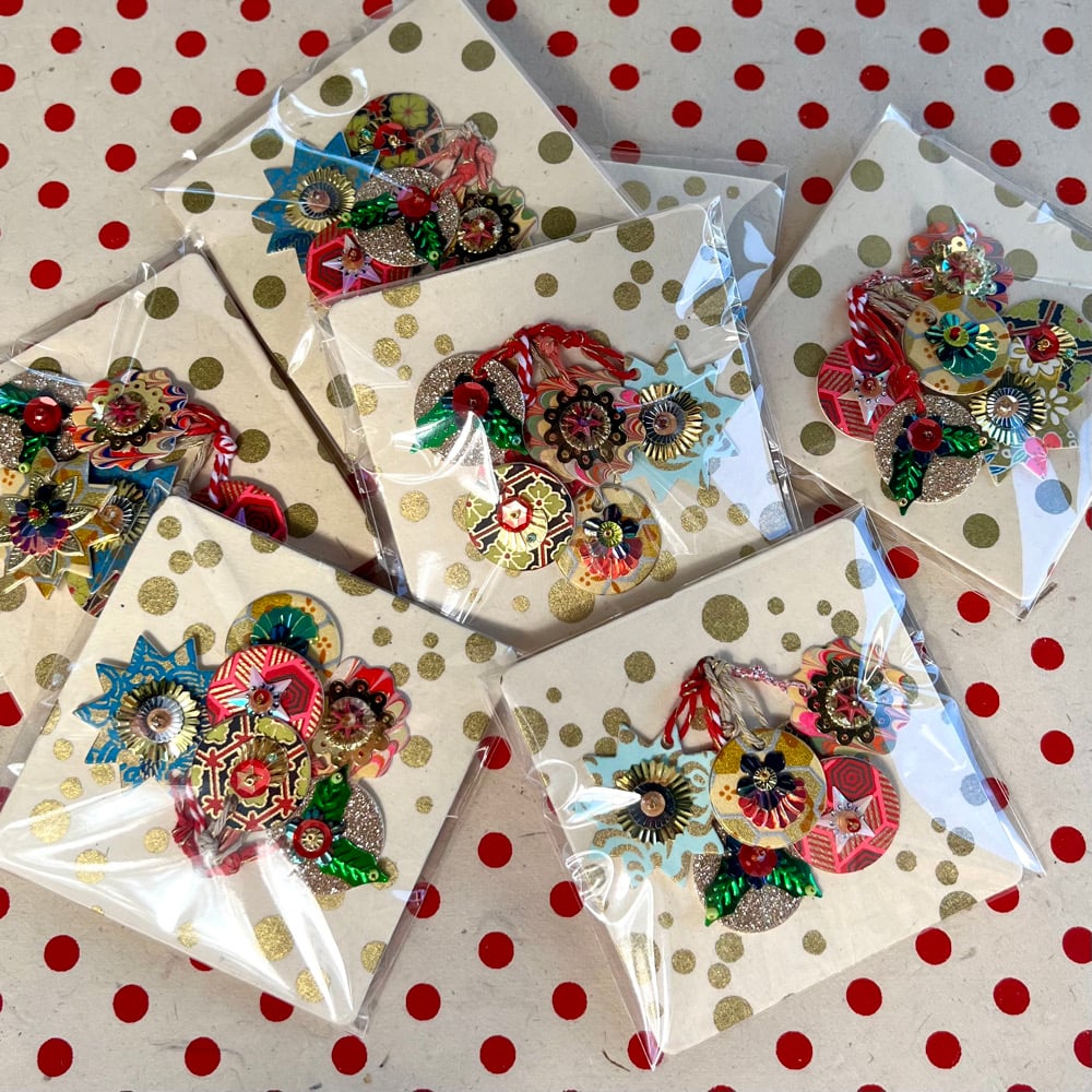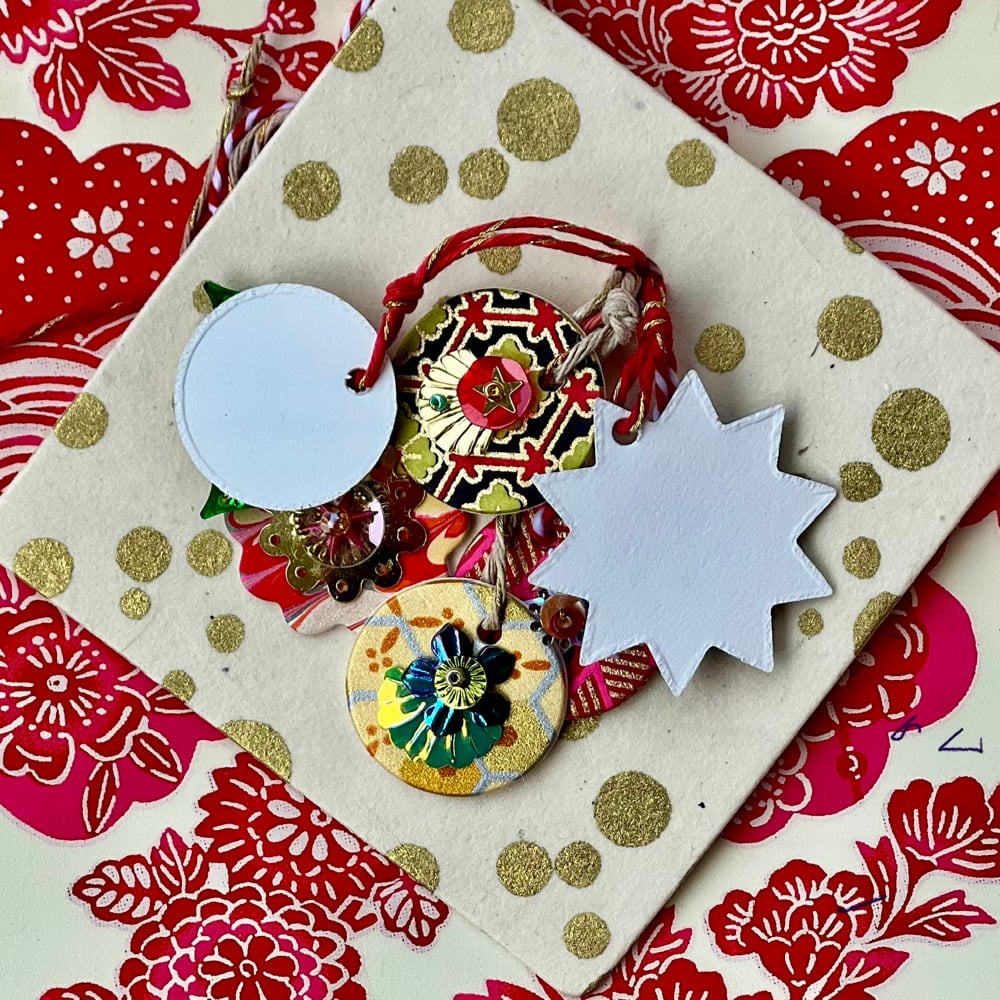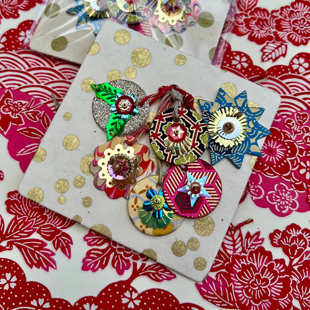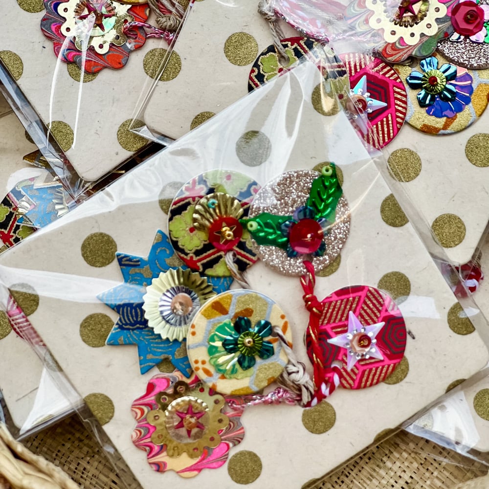 A package of five paper charms. Each charm is made of heavy cardstock, a bit of precious paper and a couple glittering sequins and beads. The reverse side is left blank should you choose to add a name or intial. Instantly elevates your gift wrap, basket handle or denotes your wine glass. Charms vary in size but roughly 1 inch in diameter.