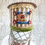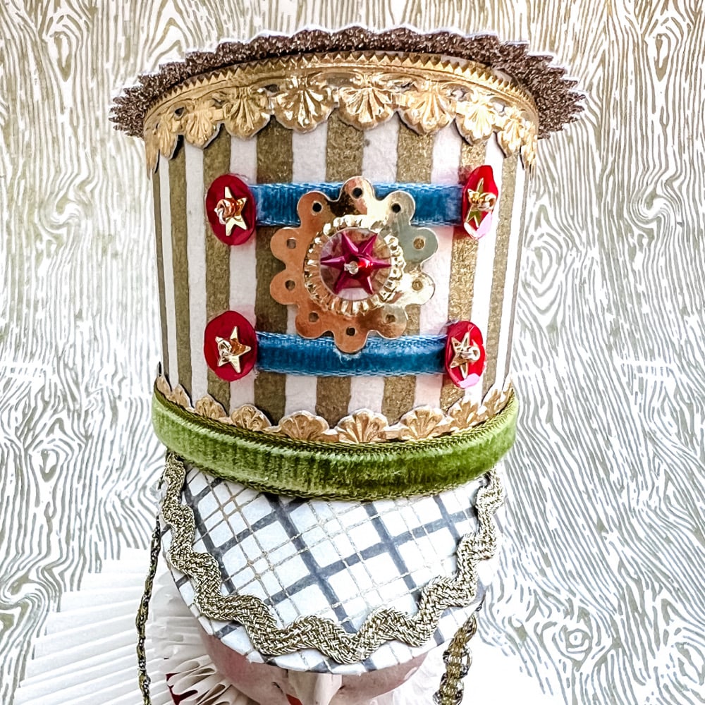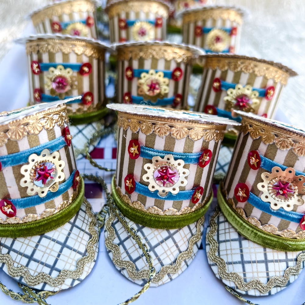 Is there a Christmas pagent? Perhas you have a figurine that needs a whimsical tweak? It can rest on a branch, package or place setting. The hat is made of paper, foil trims,velvet ribbon,sequins and stars. It measures roughly 1.75 inches wide and 2.5 inches high.