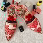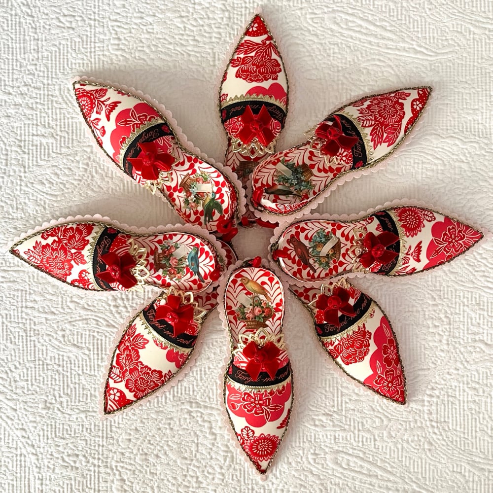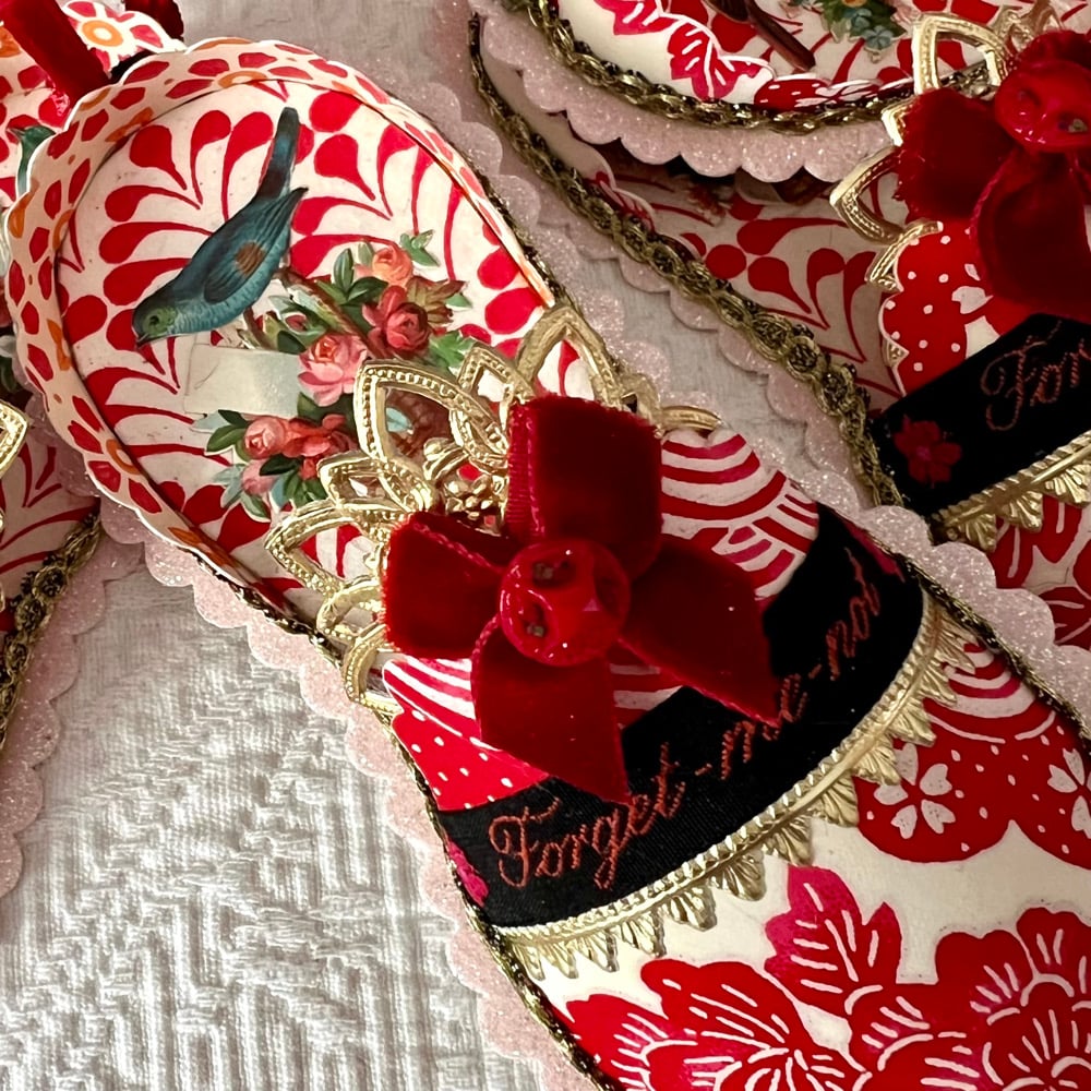 With this slipper I started with a favorite Japanese floral paper and a fine German ribbon stitched with the words "Forget-me-not". The heel of the slipper displays an antique scrap of a bird and bouquet in glorious detail. It's finished with a lush red velvet bow and an antique button from the Czech Republic. The ribbon and buttons were collected on my trip this Fall. The slipper measures 6 inches.
